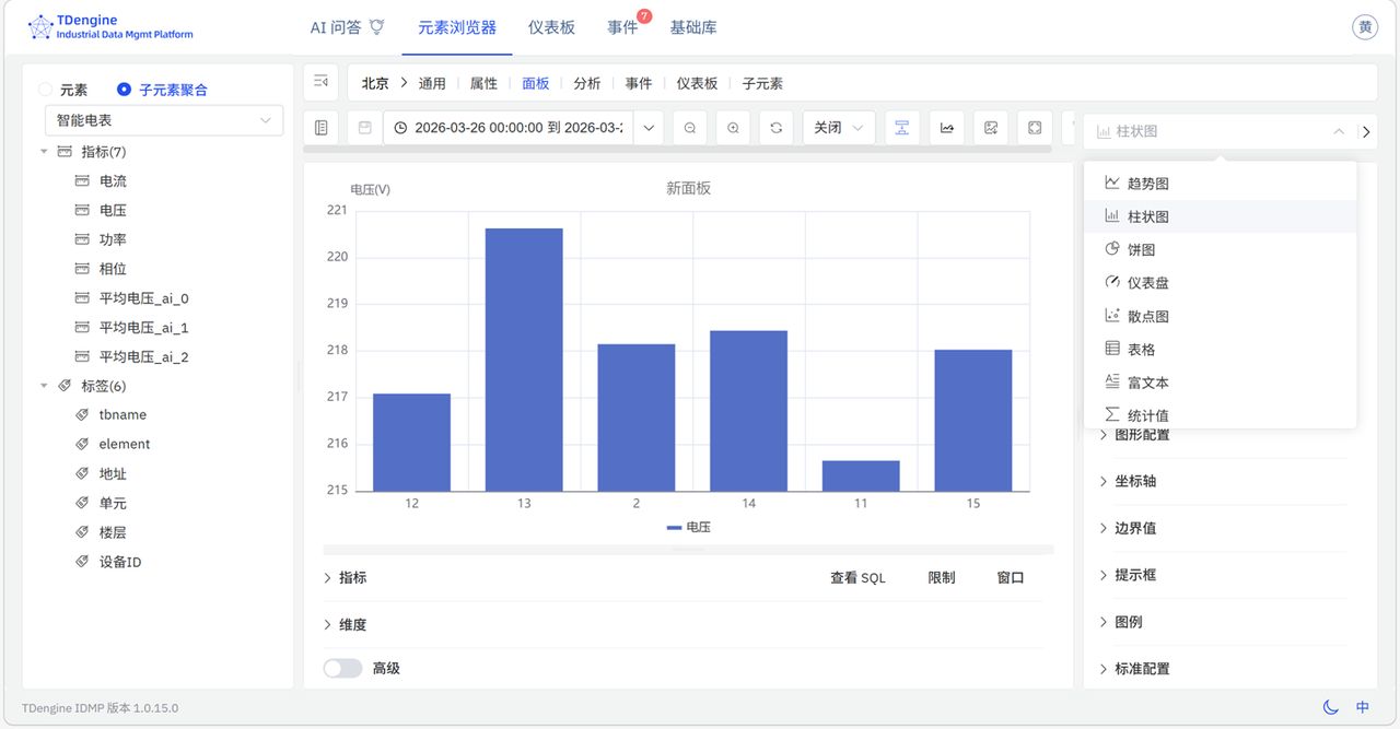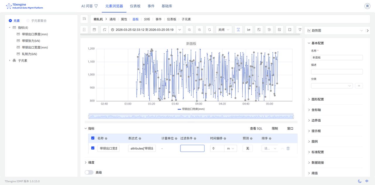 本轮更新中,TDengine IDMP 新增了更多可视化图形模板,包括状态历史图、状态时间线图等;组态面板支持自定义设计图纸上传。面板选项也新增了 element 维度、统计信息、数据链接、值映射、配色方案、渐变色等配置,面板操作新增缩放与平移功能,模板支持子元素聚合与多泳道展示,同时对默认初始时间范围进行了优化,可直接定位到最新数据窗口,仪表板还支持锁定时间范围。