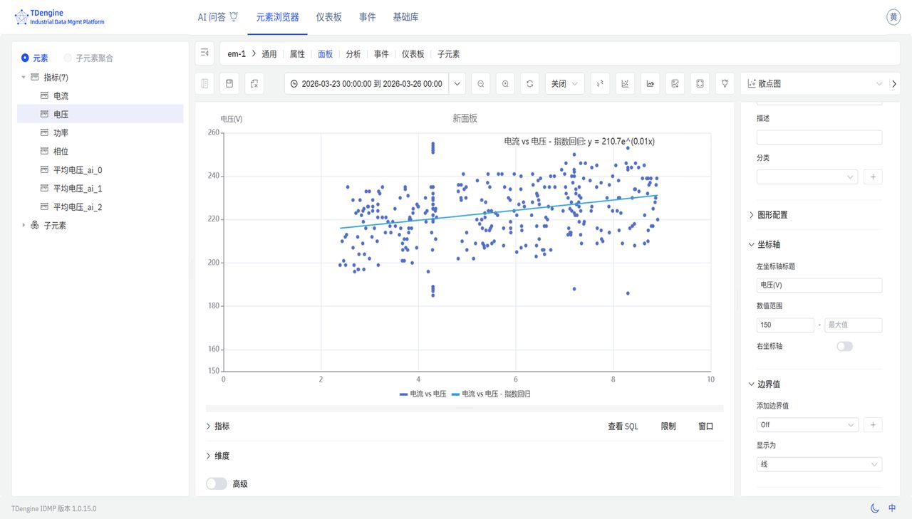 在新版本中,高级分析功能入口被移至操作栏,分析详情页新增窗口配置,支持在趋势图、散点图及过程分析视图中直接发起算法分析;趋势图与散点图的分析能力也得到增强,预测、聚类、回归等结果可以直接用于工艺诊断、参数优化和异常追溯。具体来说,主要包含以下更新: