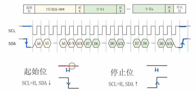 如上图所示,I2C通信的流程和它的数据帧格式是相对应的由起始位,寻址位,数据传输和停止位构成。