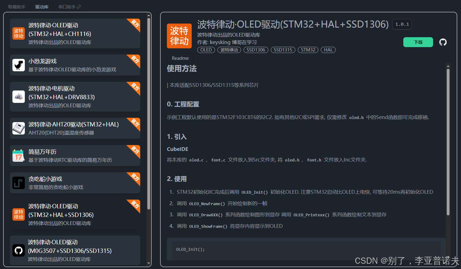 B站 UP Keysking 做了详细的OLED显示屏教学,并且在他的开源网站 波特律动文档站 给了丰富的驱动文件,因此我们就无需自己再去实现字模和图像的函数了,直接从网站下载移植即可。