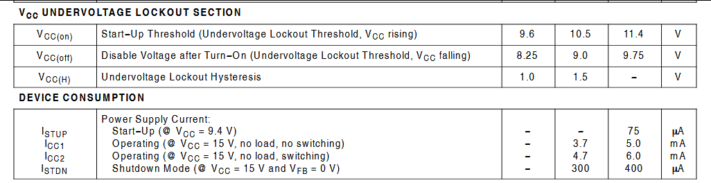 | ISTUP | 启动阶段(VCC 升至 10.5 V 之前) | < 75 μA | 75 μA | 电流极小!这意味着启动电阻可以用很大阻值(如几兆欧),既满足启动充电要求,又能将待机损耗降至毫瓦级。 |