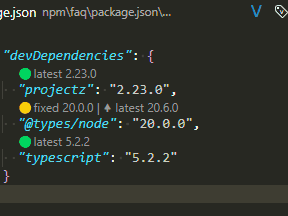 package.json→ 每一行依赖右侧自动显示版本提示 - 悬停查看:发布时间、latest/next 标签、跳转 npm 官网