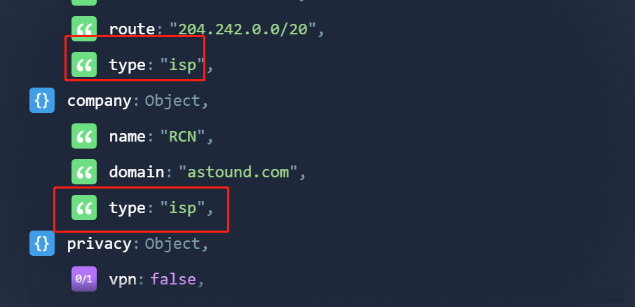 可以在ipinfo查询是否为双ISP。在type一栏可以看到结果,如果是双ISP,两栏都会显示type:"isp"。如果显示type:"hosting",则一般为机房IP。