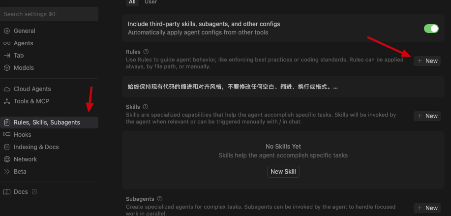 设置 UserRules:选择 Cursor -> 设置 -> Cursor Settings(如下图),然后选择Rules, Skills, Subagents,在 Rules 下点击新增,把user_rules.mdc中内容拷贝进去即可。