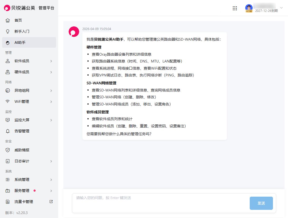 蒲公英AI助手覆盖路由器管理、组网网络及成员管理等核心场景,可实现设备查询、配置管理与批量操作的一体化调用。