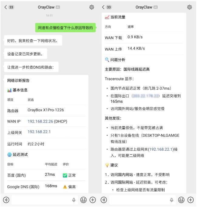 OrayClaw就可以自动调用相关能力,对当前设备列表、流量占用、延迟、丢包、DNS响应等情况进行综合诊断,并将结果以更直观的方式反馈。