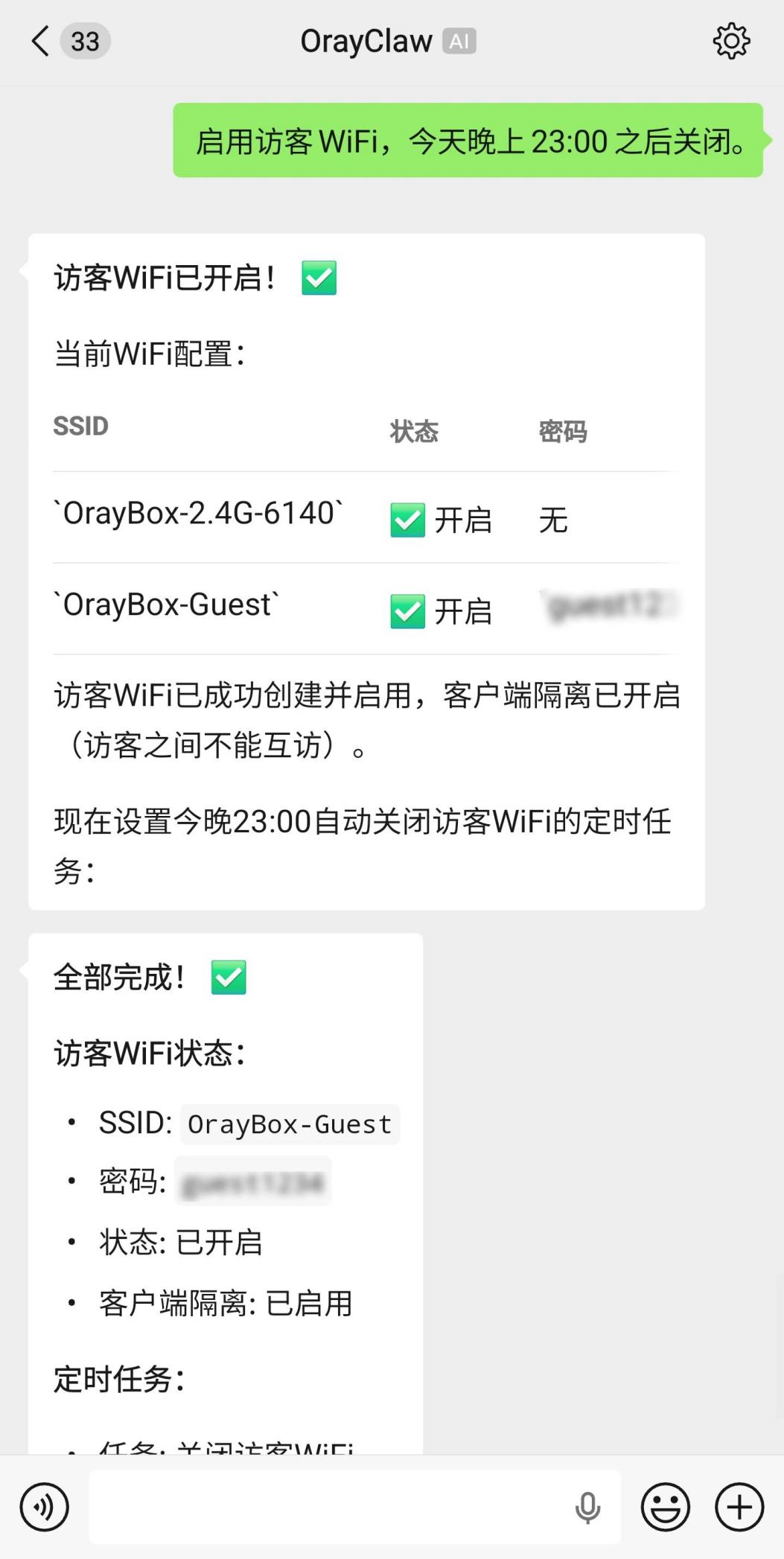 传统方式下,这类操作往往需要登录后台,手动创建访客网络,再设置名称、密码和关闭时间;而现在,只要说一句:"启用访客WiFi,今天晚上23:00之后关闭。"OrayClaw就可以自动完成访客网络创建,并设置好定时任务,在约定时间后自动关闭。