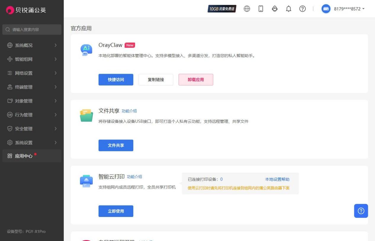 而这一次,蒲公英X1 Pro将AI Agent的运行能力直接添加到了路由器上,无需云服务器、无需额外主机,无需复杂设置,一键就能安装OrayClaw!具体来说,只需给X1 Pro接入U盘或移动硬盘,并将OrayClaw组件升级至最新版本,即可进入路由器云管理的应用中心完成安装!
