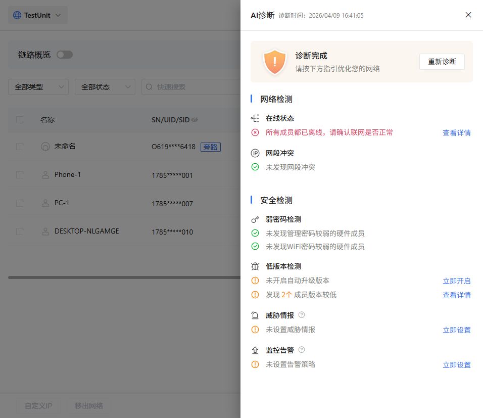 同时,蒲公英管理平台还提供一键AI诊断功能,从在线成员、网络冲突、访问策略,到弱密码、威胁情报与告警策略,系统会自动完成检测、分析与汇总,并以清晰的状态结果呈现给管理员。