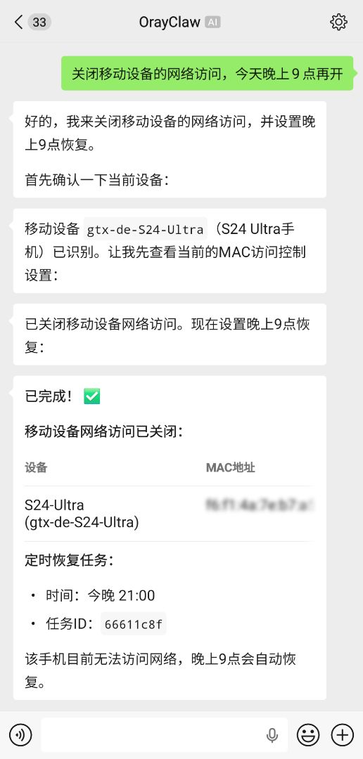 对于不熟悉网络设置的人来说,这类过程不仅繁琐,而且容易出错。而在X1 Pro内置OrayClaw的情况下,你只需要说:"关闭XXX设备的网络访问,晚上9点再开。"OrayClaw就可以先识别目标设备,再执行断网,并同步设置恢复时间。