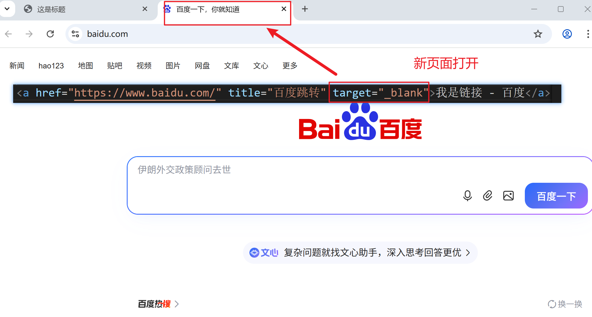 <a href="https://www.baidu.com/" title="百度跳转" target="_blank">我是链接 - 百度</a>