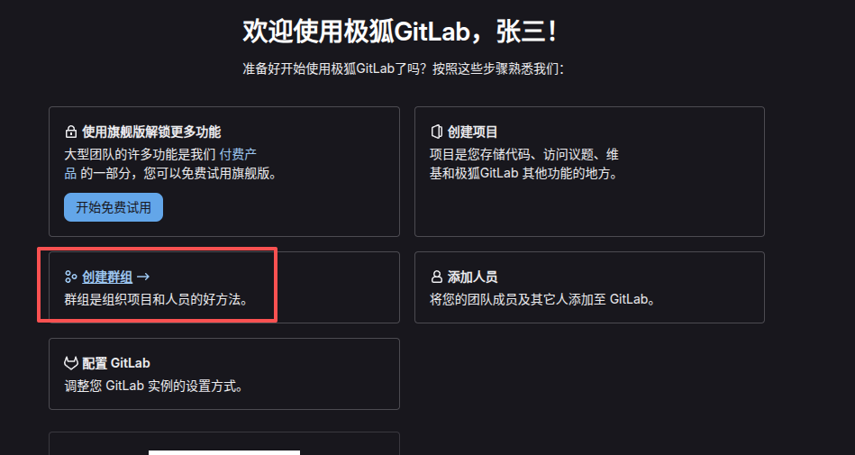 如果新建项目之前我们没有创建任何的群组,那么这里的页面会指引我们先创建组。群组的存在还有另外一个功能:它就是电脑上的文件夹。使用电脑时,我们当然可以将所有的文件都无差别的堆到电脑的根目录里,但是这样一定是非常混乱的,因此把不同的文件归类到不同的文件夹就很有必要。我们只以张三的视角来看,它创建的群组完全就是例子中的文件夹,极大的解决代码存放混乱的问题。至于权限,那则是张三分配到下级用户的,下级用户也能在自己的权限内体验到张三将各个工程分门别类带来的便利。类似于Ubuntu系统的普通用户和root用户,各用户都共享了完全相同的目录结构,只是有无权限查看内容的区别。