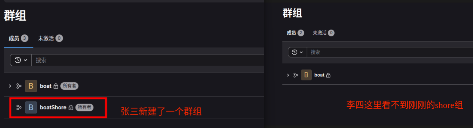 这样一来我们的群组就创建好了,需要注意的是,打工人李四虽然不在Boat这个大的群里,但是他在里面的boatControl里,因此他是能够看到Boat的,但是他无法访问除了Boat群组内的boatControl之外的其他Boart群组。我们登录李四的账号,进入Boat群看看: