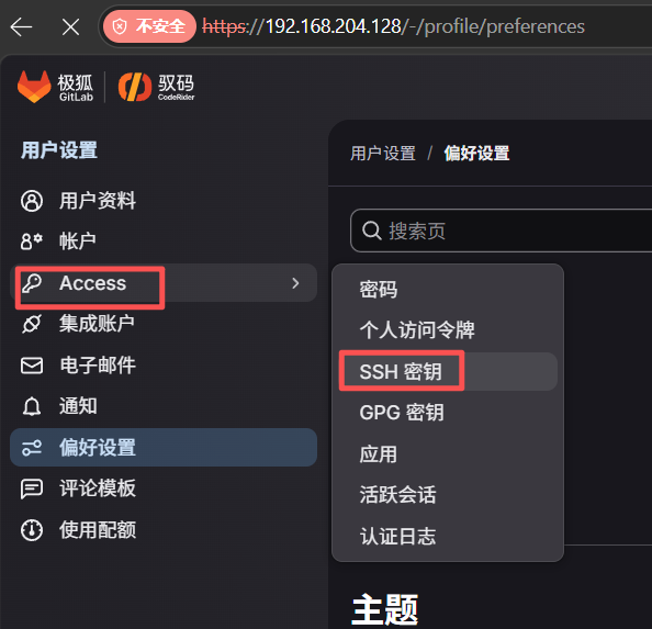 将这个文件的所有内容复制下来,来到张三的gitlab界面,点击头像进入偏好设置,进入之后按图找到ssh秘钥