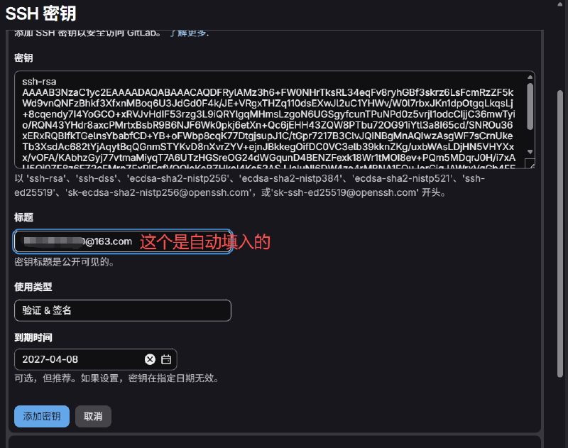 这个是可以无限制添加秘钥的,如果还要添加更多直接点击添加就好。ssh秘钥相当于本电脑的唯一通行证,将windows的秘钥填入gitlab中就相当于gitlab认识windows电脑并允许跟windows电脑互动了,感兴趣的小伙伴也可以自己试试如何在Ubuntu下制作自己的秘钥。