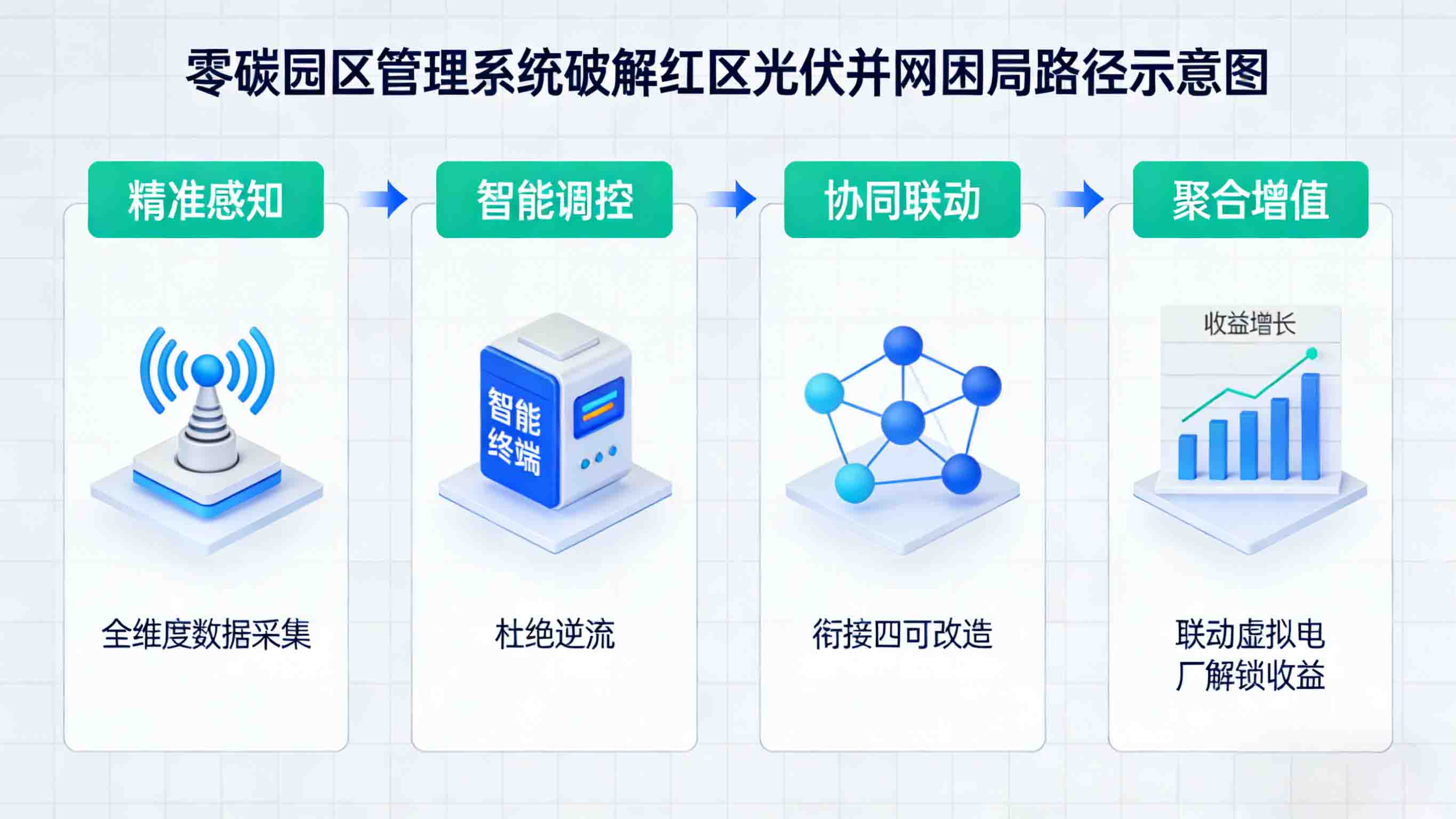 结合红区光伏并网痛点与零碳园区建设需求,零碳园区管理系统通过四大核心路径,实现红区光伏并网困局的系统性破解,每一步均贴合行业实操,可直接适配存量、新建等各类红区光伏项目,衔接四可改造、虚拟电厂等核心环节。