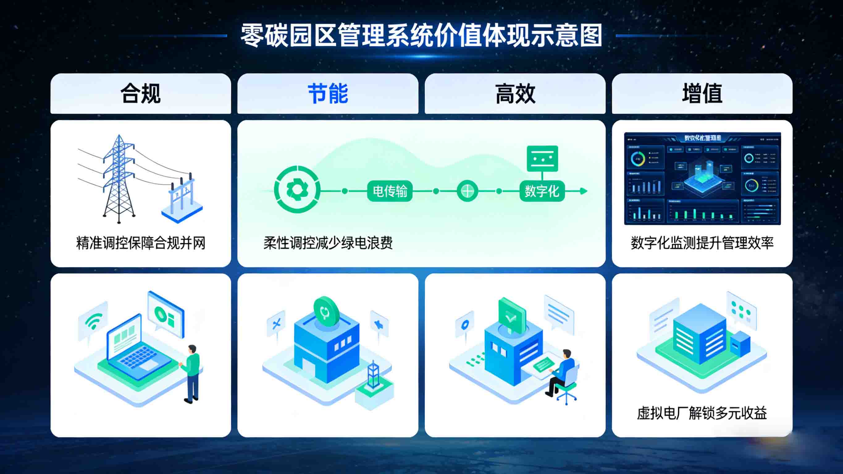 - 从增值层面 ****:****虚拟电厂聚合与绿电交易,解锁了光伏项目的多元收益,提升了投资回报,为零碳园区的可持续发展提供了经济支撑。