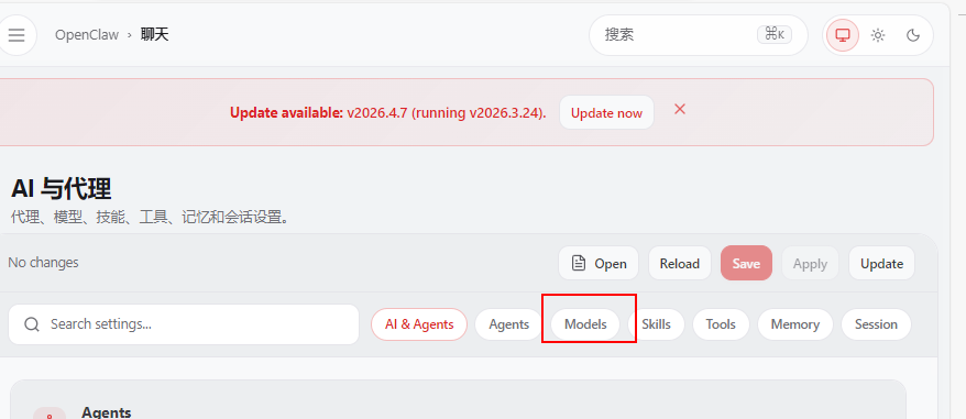 打开小龙虾平台,在左侧找到设置里的AI与代理