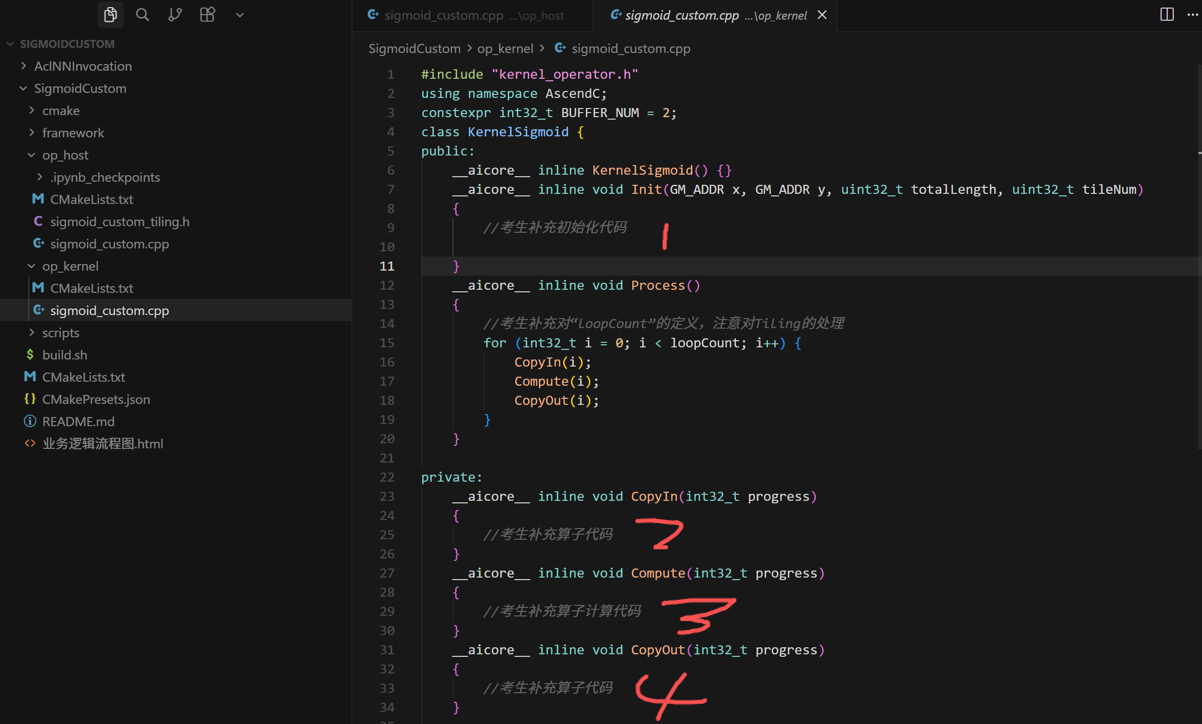 查阅SigmoidCustom\op_kernel\sigmoid_custom.cpp文件