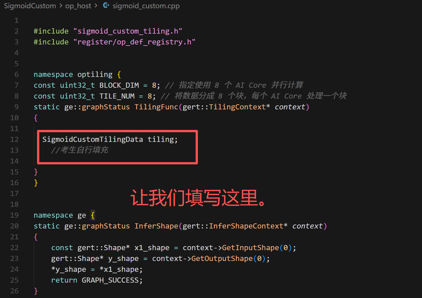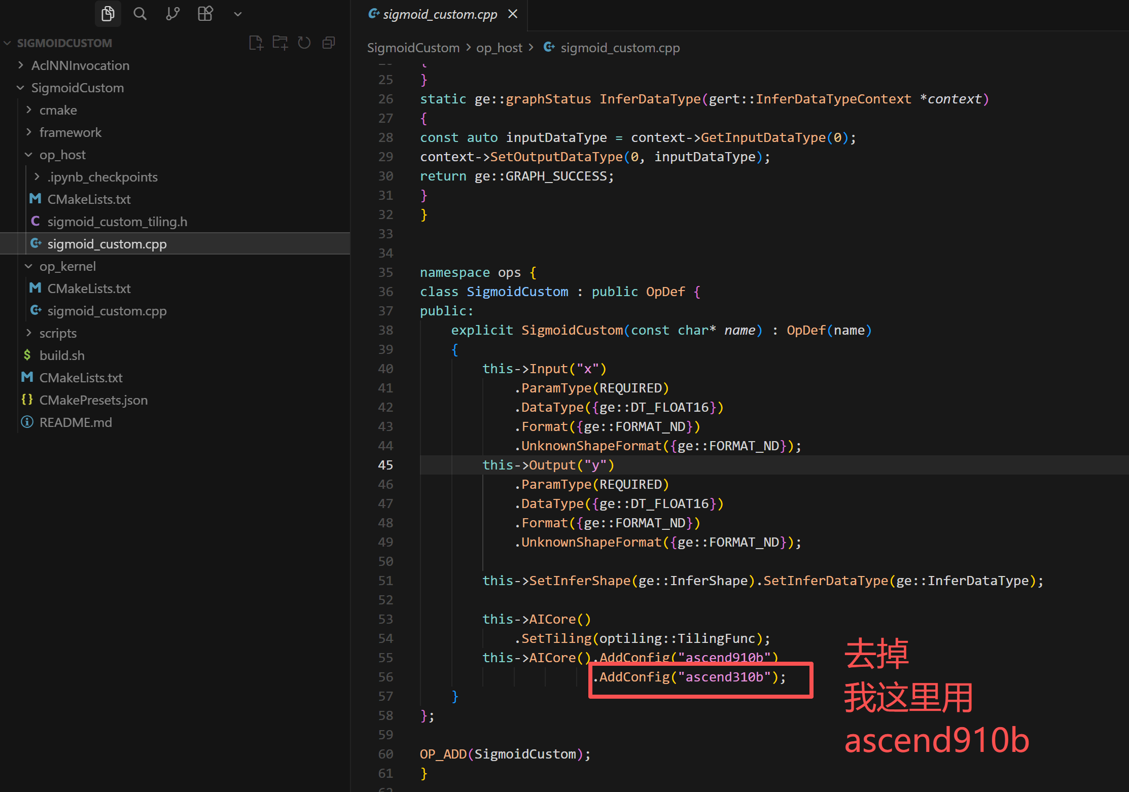 查阅SigmoidCustom\op_host\sigmoid_custom.cpp文件