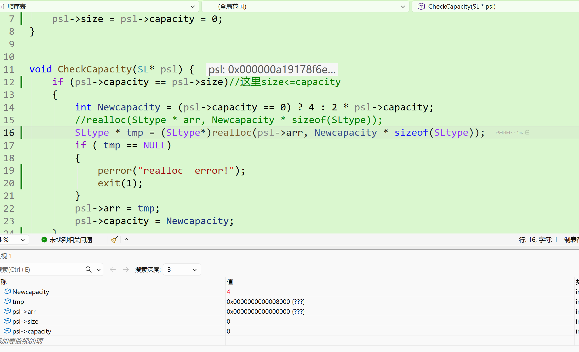 这里整个数组的容量被指为0,需要后期去realloc增容