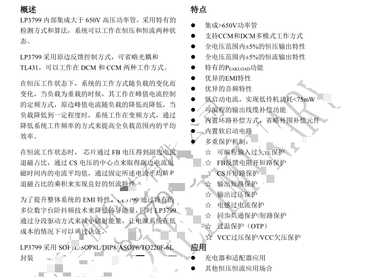 LP3799FAC 与 LP3799FBC 是集成高压 MOS 管的原边反馈(PSR)反激式电源芯片,为60W(24V/2.5A)非标隔离电源设计,该非标方案集成度高、外围精简、效率与 EMI 表现优异,适合小体积、低成本的适配器、充电器及工业电源场景。