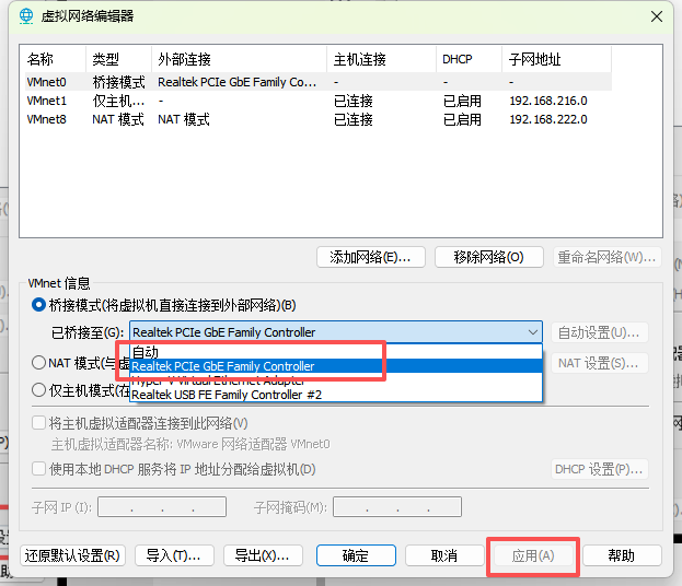 注意:如果公司 做了 MAC 地址绑定、IP-MAC 绑定,桥接模式可能无法正常获取 IP,需要用 NAT 模式。