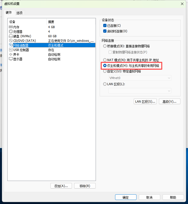 虚拟机设置成仅主机模模式: