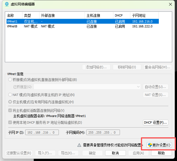 选择仅主机模式后,点击更改设置: