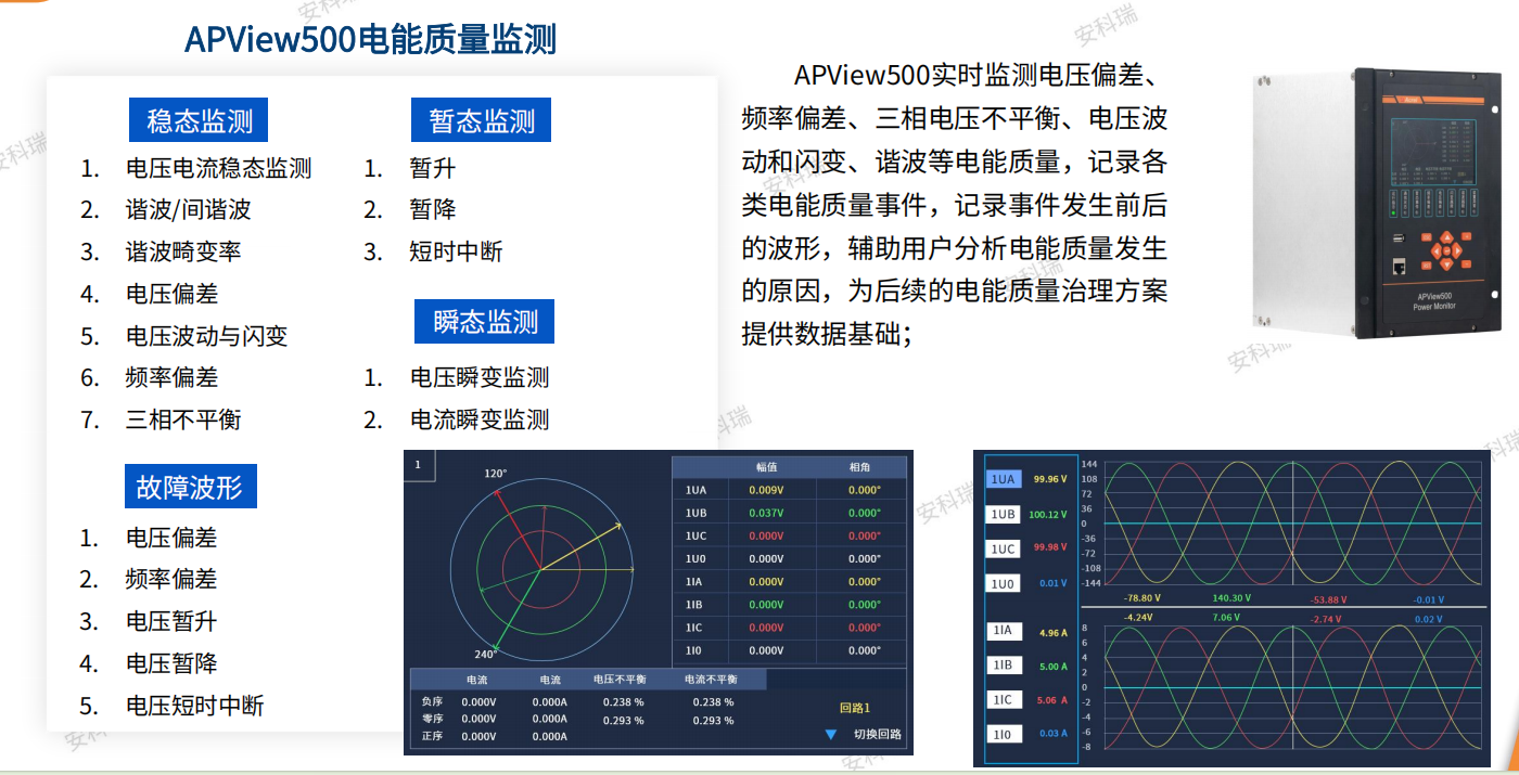 电能质量监测是治理的第一步。APView500电能质量在线监测装置可对电压偏差、频率偏差、三相电压不平衡、电压波动和闪变、谐波等指标进行实时监测。当发生电压暂升、暂降或短时中断时,装置自动记录事件发生前后的波形,辅助用户分析原因。这种故障波形记录功能,就像飞机的"黑匣子",为后续的电能质量治理方案提供精确的数据基础。根据国家标准,光伏电站并网点应装设A类电能质量在线监测装置,监测点应放置在并网点,对谐波、直流分量、电压波动和闪变、三相不平衡度等进行在线监测。