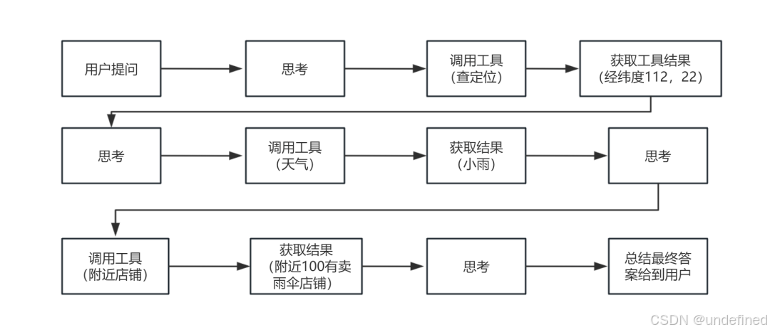 比如我给大模型说:今天广州的天气怎么样?有没有下雨?如果下雨了的话,帮我看看附近有没有店铺可以买雨伞?