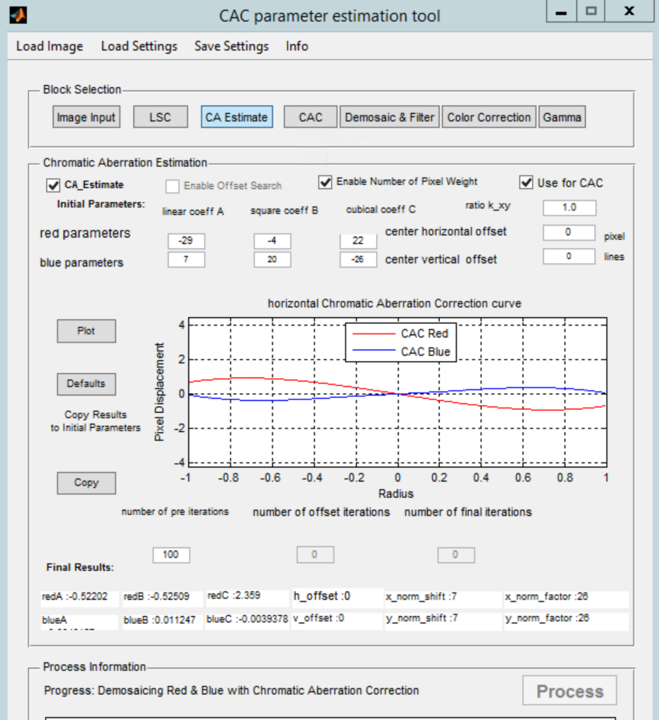 初始参数用作色差校正函数估计的起点。如果已加载的测试图像存在参数值,则应在此输入;否则,应使用默认值。