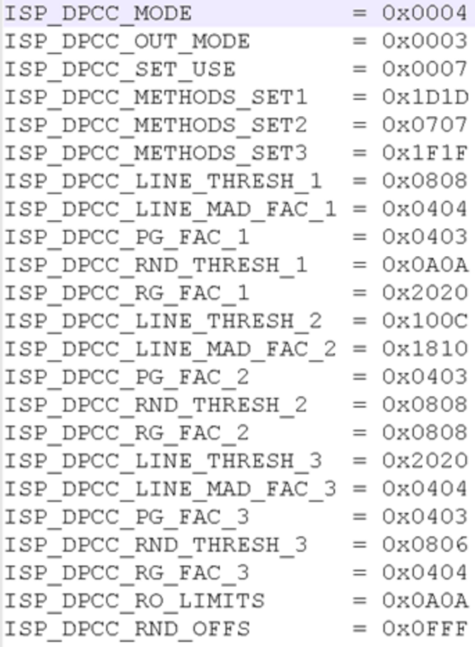 DPCC(Defect Pixel Color Correction,缺陷像素色彩校正)的校准数据提供在发布包中包含的dpcc_para.txt文件中。