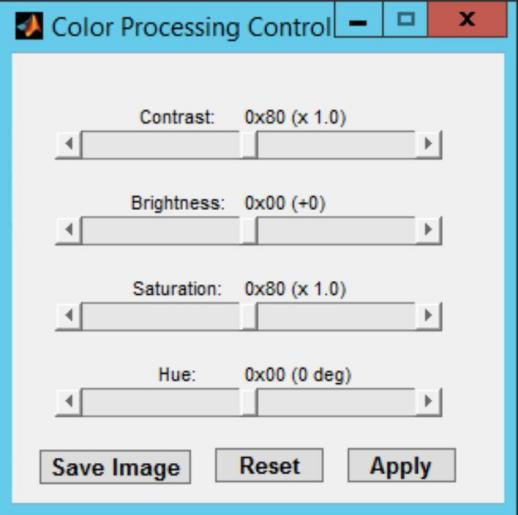 处理测试图像后,结果图像会显示出来。在下面图显示的Color Processing Control窗口中,展示了色彩处理功能,这些功能允许修改对比度、亮度、饱和度和色调。