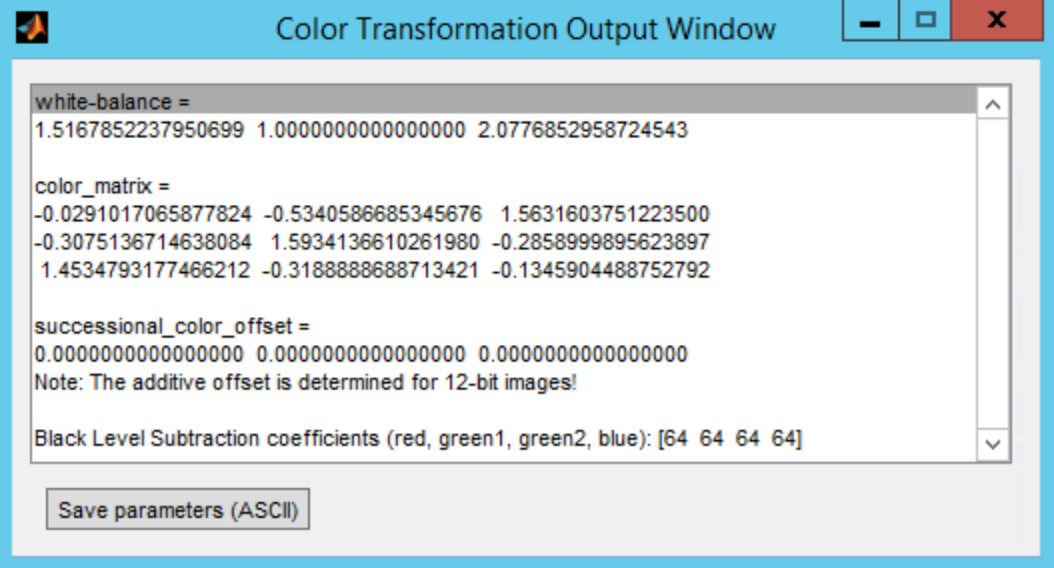 为了成功计算CAC参数,测试图像需要有正确的白平衡;否则,工具中用于推导CAC参数的非线性优化函数可能无法收敛。因此,需要在这里指定正确的白平衡(WB)增益值。另外,也可以使用自动白平衡,这是工具中实现的简单灰度世界方法,用于推导WB增益值。灰度世界方法在这种情况下是完全足够的,因为使用的CAC测试图表是黑白的。只需在WB增益编辑字段下方勾选Auto White-Balance复选框即可。也可以插入正确的色彩校正矩阵(X-Talk Matrix)(这是可选的 - 它不影响参数估计过程,只影响最终图像输出)。这些参数需要通过CC工具针对生成CAC测试图像时使用的相同照明条件来推导。参数可以直接输入,也可以从CC工具生成的ASCII文本文件中加载。点击Load ASCII file选项来加载ASCII文本文件。
