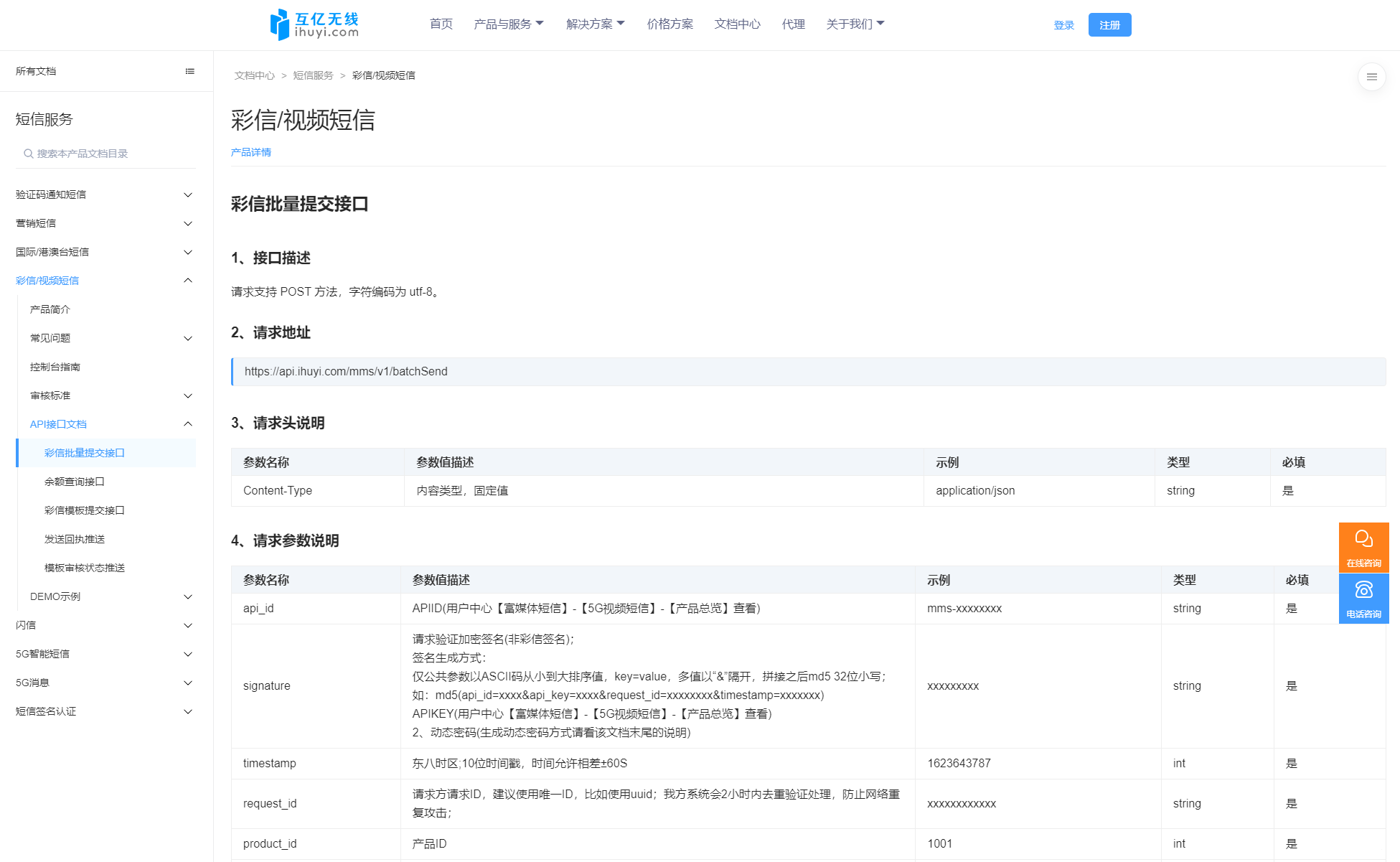 https://api.ihuyi.com/mms/v1/batchSend - 请求头固定配置: