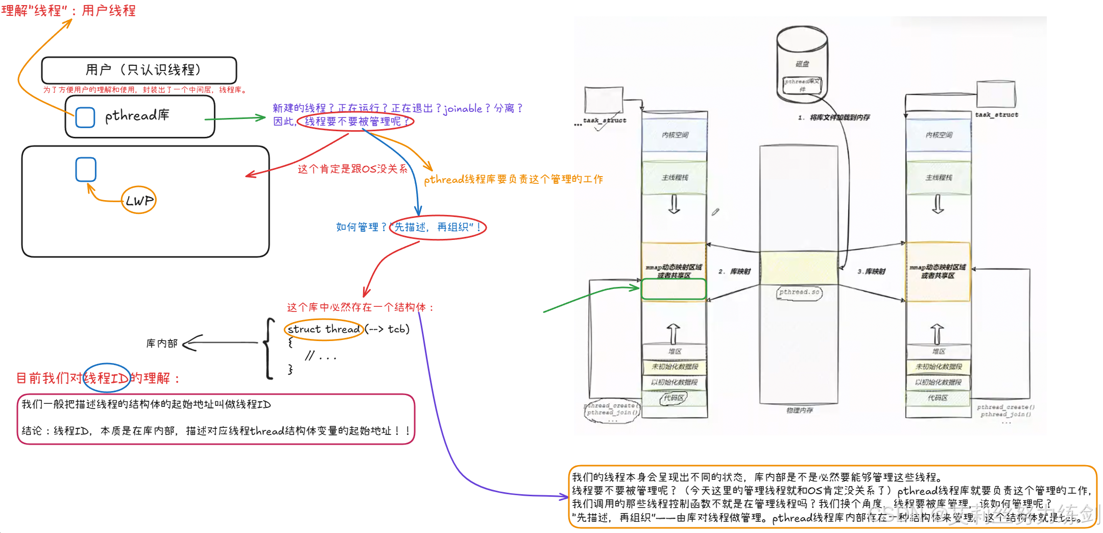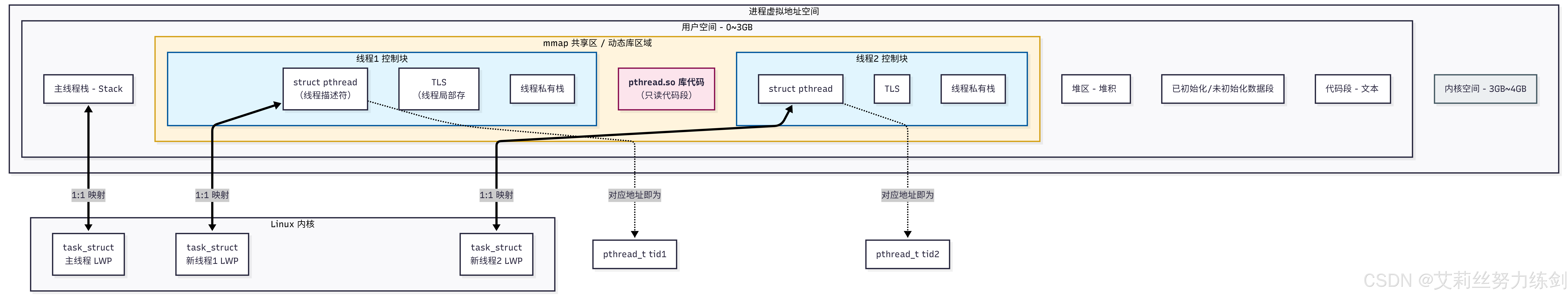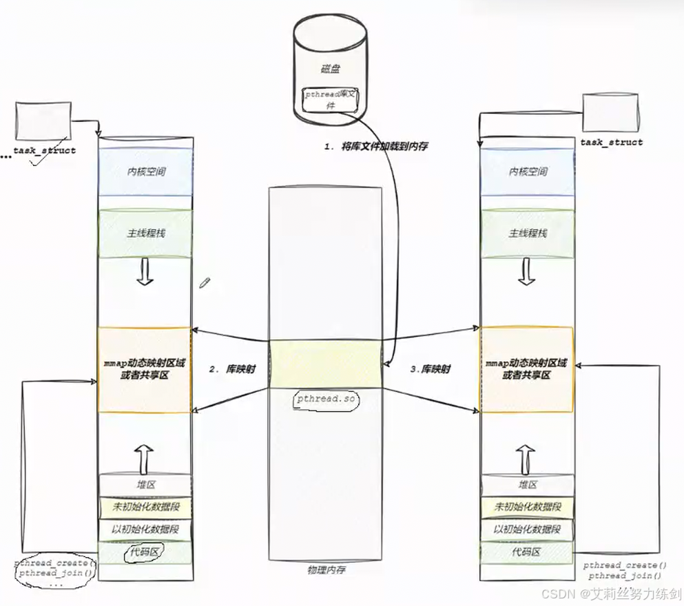 我们要理解"Linux 线程库 (pthread) 的加载原理 以及它在虚拟地址空间中的映射关系"。