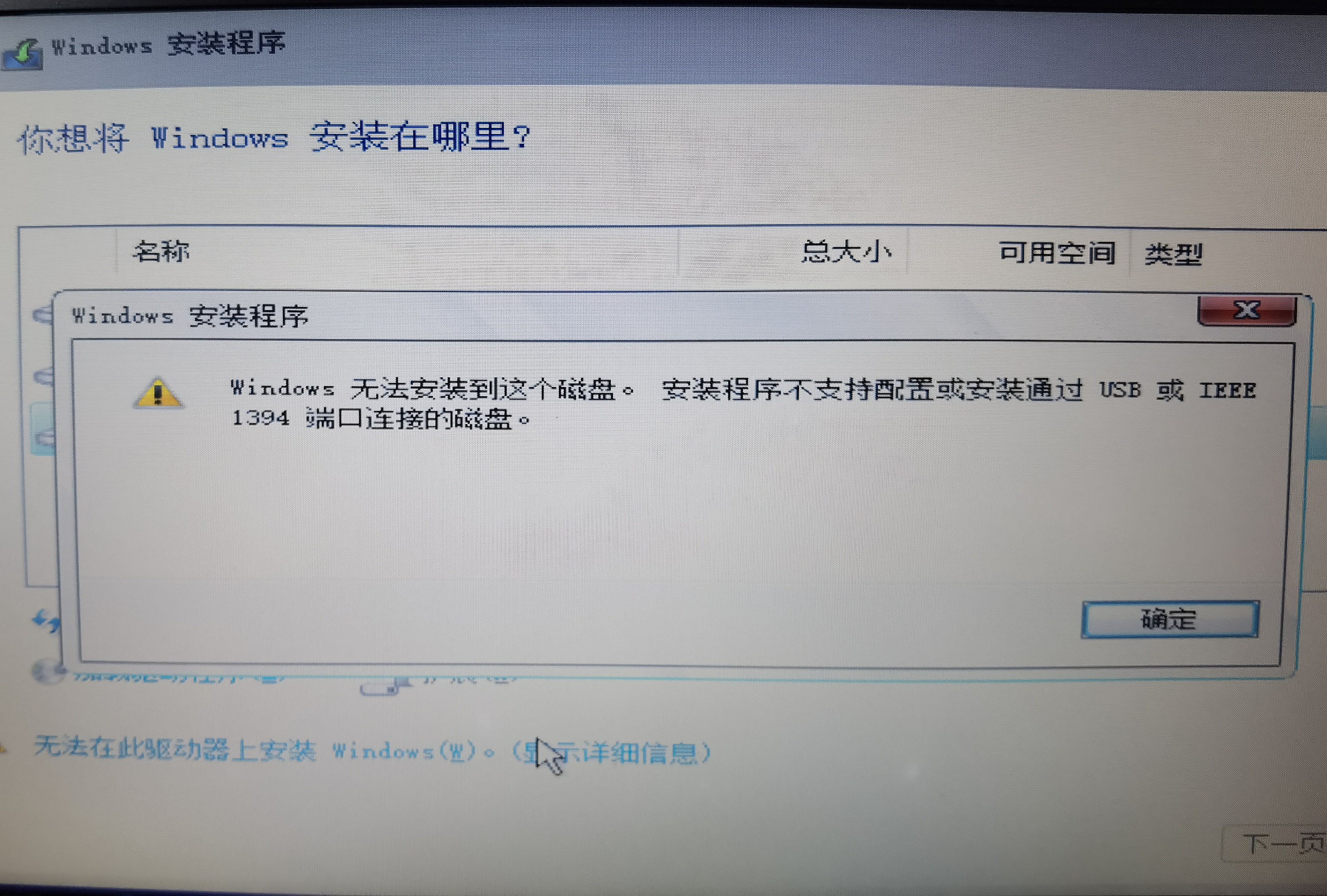 通过Windows10安装U盘安装Windows10,磁盘选择移动硬盘,点击安装,出现如下提示