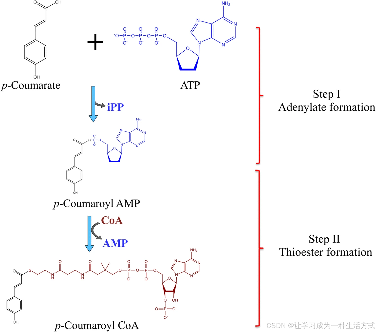 4CL 催化的反应机制 4CL 通过两步反应将对香豆酸转化为对香豆酰辅酶 A:第一步,形成腺苷酸中间体;第二步,进而形成硫酯产物。