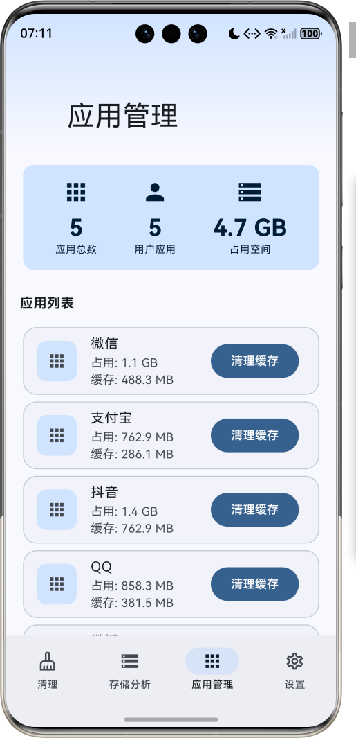 | 应用管理 | 管理应用程序,清理应用缓存 | 列表展示 |