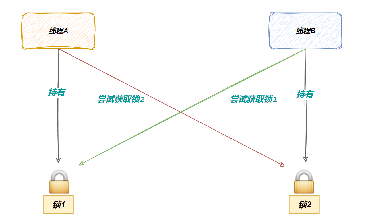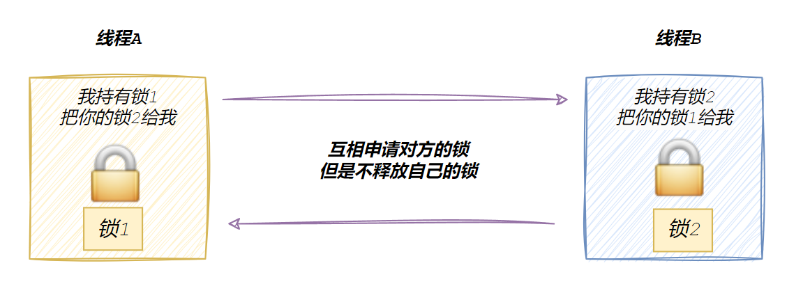 为了⽅便表述,假设现在线程A,线程B必须同时持有锁1和锁2,才能进⾏后续资源的访问