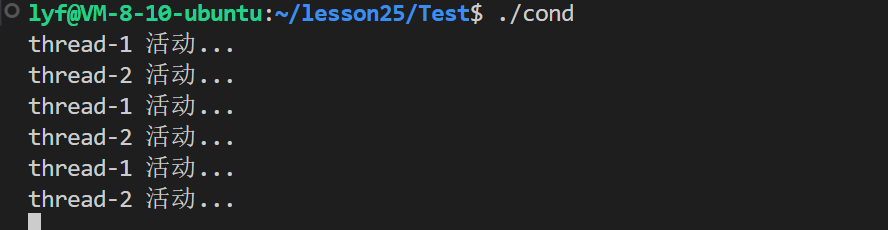 cpp#include <iostream> #include <string.h> #include <unistd.h> #include <pthread.h> pthread_cond_t cond = PTHREAD_COND_INITIALIZER; pthread_mutex_t mutex = PTHREAD_MUTEX_INITIALIZER; void *active(void *arg) { std::string name = static_cast<const char *>(arg); while (true) { pthread_mutex_lock(&mutex); pthread_cond_wait(&cond, &mutex); std::cout << name << " 活动..." << std::endl; pthread_mutex_unlock(&mutex); } } int main(void) { pthread_t t1, t2; pthread_create(&t1, NULL, active, (void *)"thread-1"); pthread_create(&t2, NULL, active, (void *)"thread-2"); sleep(3); // 可有可⽆,这⾥确保两个线程已经在运⾏ while (true) { // 对⽐测试 // pthread_cond_signal(&cond); // 唤醒⼀个线程 pthread_cond_broadcast(&cond); // 唤醒所有线程 sleep(1); } pthread_join(t1, NULL); pthread_join(t2, NULL); }