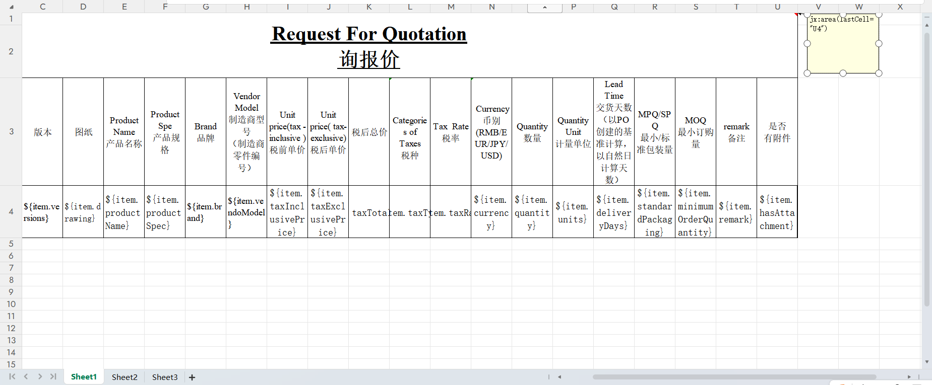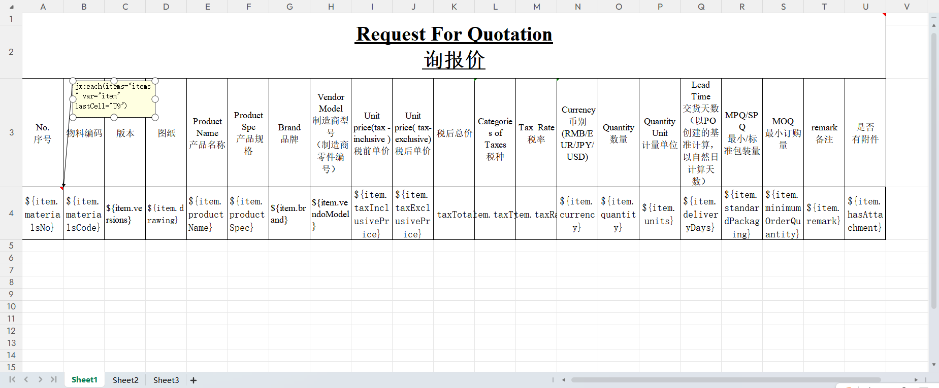 在循环数据列的第一个单元格批注设置jxls指令进行循环展示数据,如:jx:each(items="items" var="item" lastCell="U9")