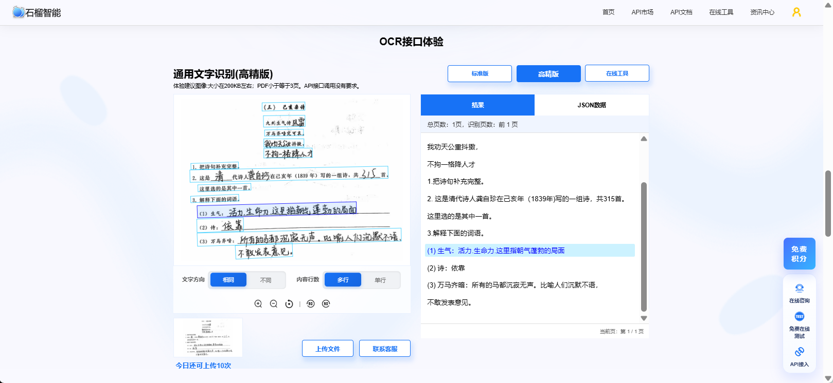 👉 建议直接体验石榴智能的文字识别API接口,支持免费测试,几分钟即可完成接入。