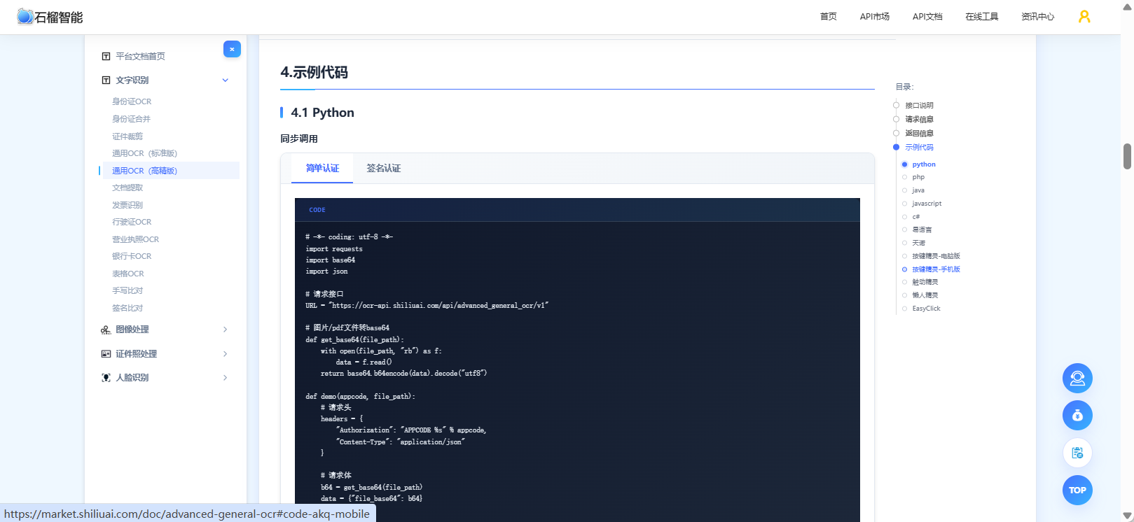 👉 支持免费在线体验,API文档齐全,有各语言的接入代码:http://test.market.shiliuai.com/general-ocr
