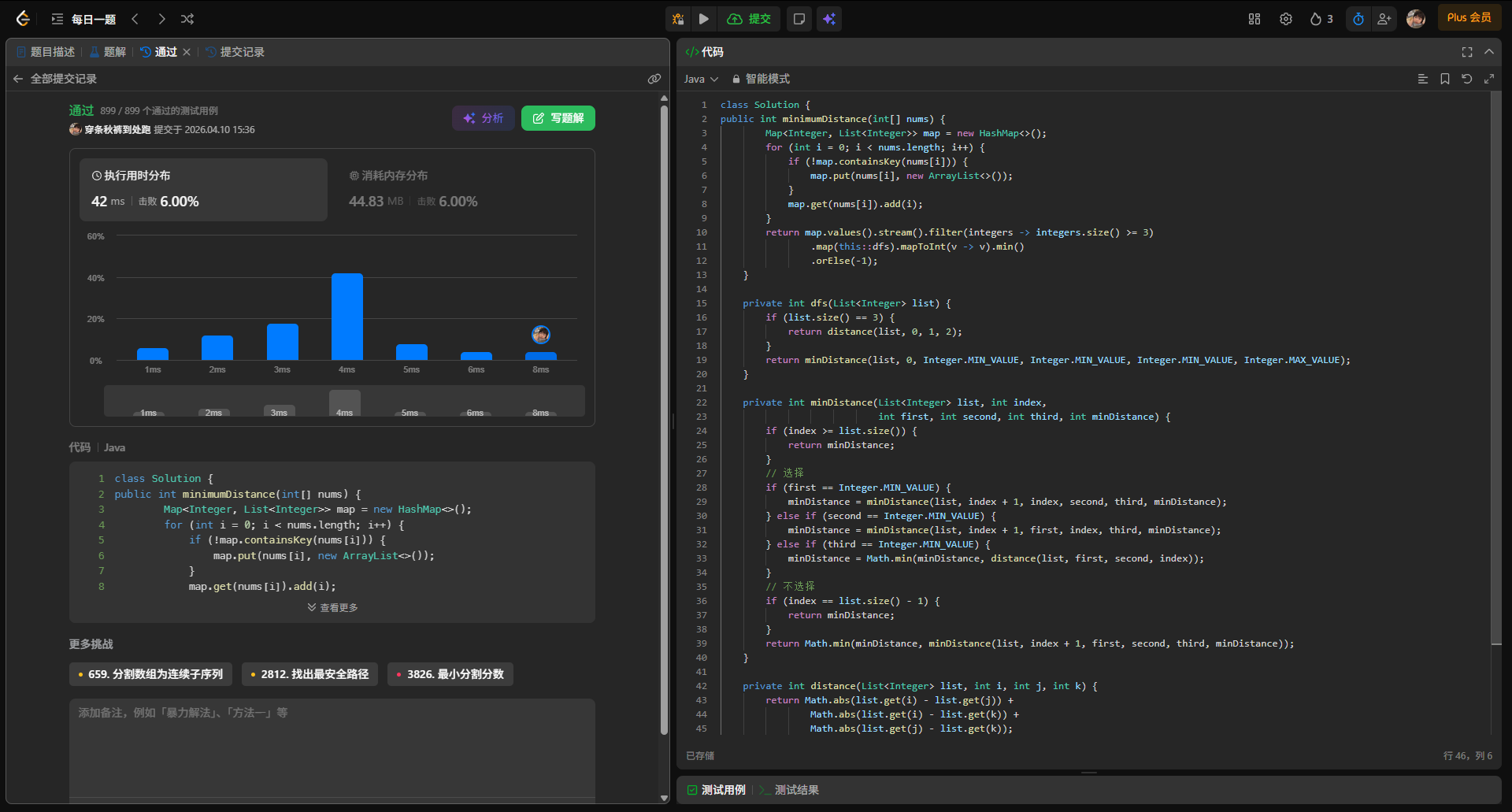 下面是官方的题解,确实更优,使用三层循环,分别对应原数组上不同下标的三个元素,第一个的范围是0到n-3,第二个的范围是1到n-2,第三个的范围是2到n-1,然后当三者的值相等时,计算一次距离,以此遍历,可以快速计算出最小的距离,少了很多循环。