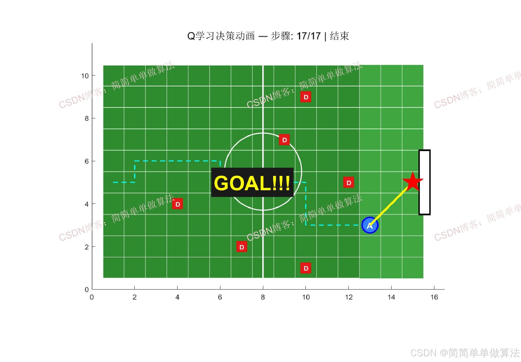 本算法以简化RoboCup足球场景为测试平台,采用Q学习算法实现进攻Agent的智能决策,包括路径规划、避障和射门策略的自主学习。具体实现步骤如下: