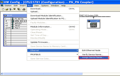 配置完成后,编译保存项目。接下来分配Device name。选中硬件配置中的PN/PN Couple,点击PLC菜单-〉Ethernet选项,选择Assign Device Name,如下图所示: