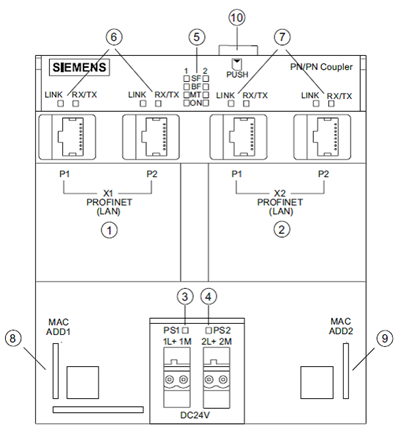 ④电源连接2及指示灯 ⑨ PROFINET IO 网络2的MAC地址