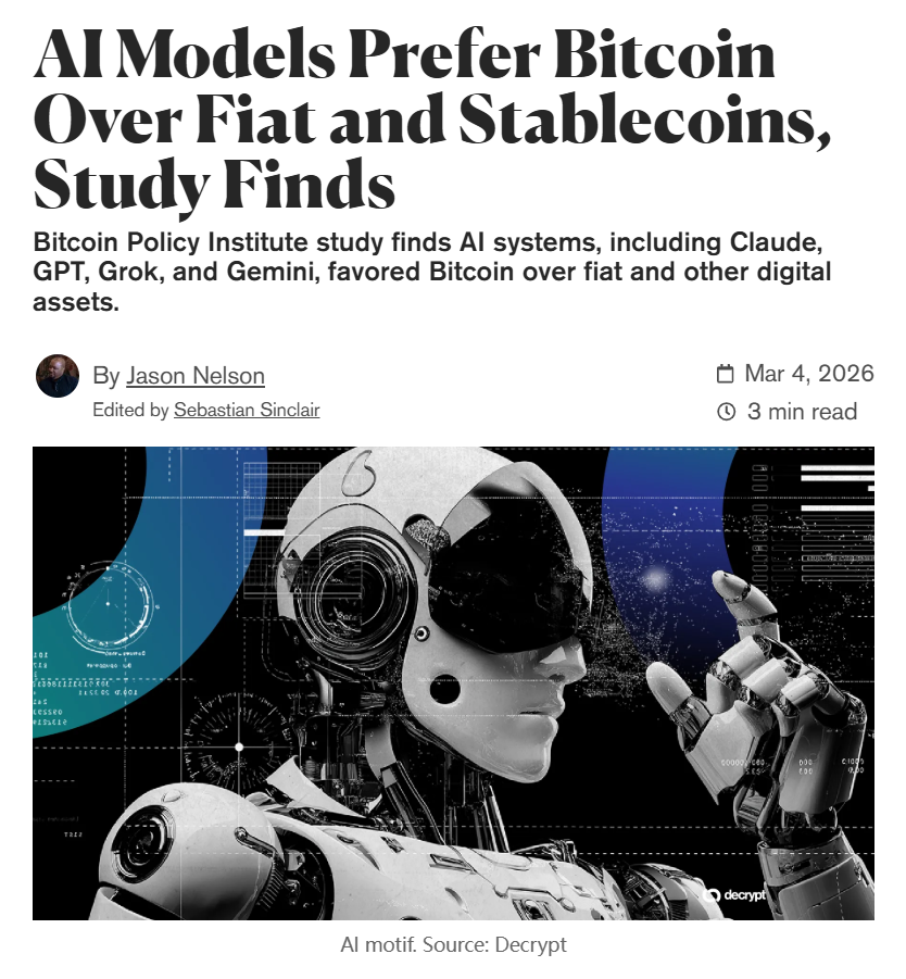 比特币政策研究所(Bitcoin Policy Institute)近日的一项模拟研究表明:在 36 个主流 AI 模型(包括 GPT、Claude、Grok、Gemini 等)中,有 22 个在经济决策场景下选择比特币作为首选货币工具。这一结果说明: